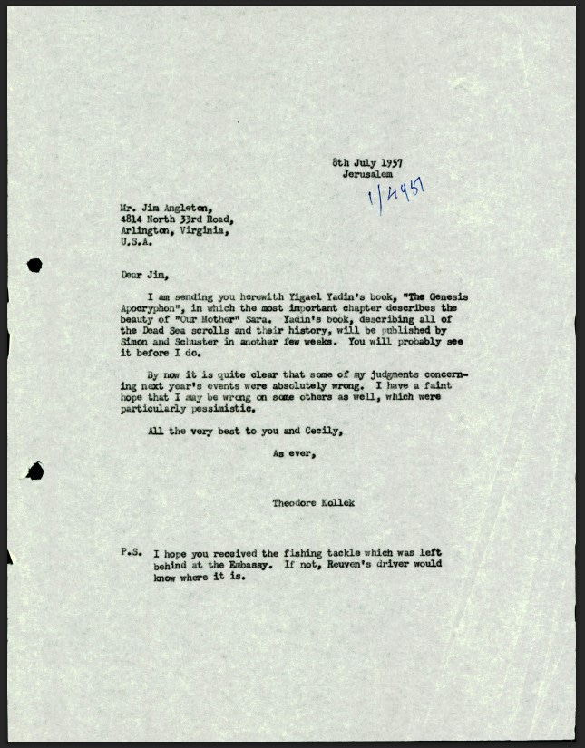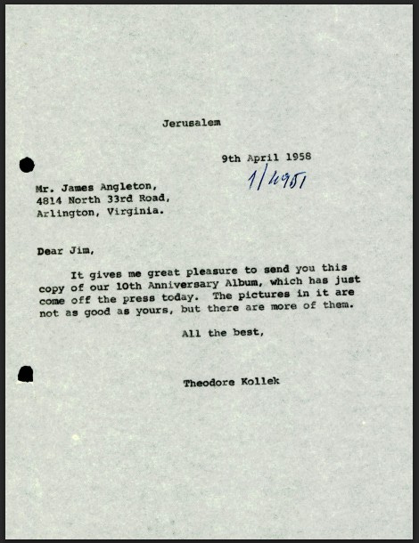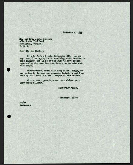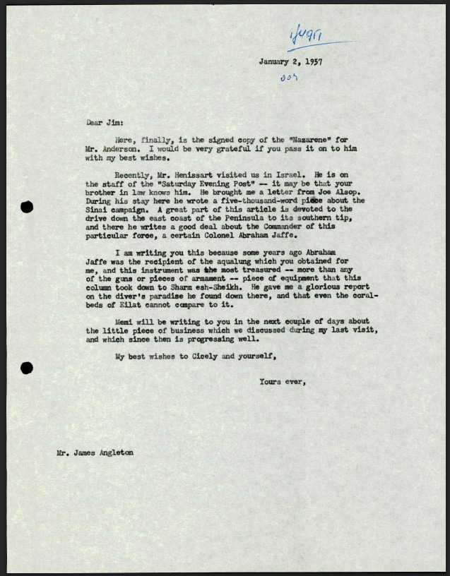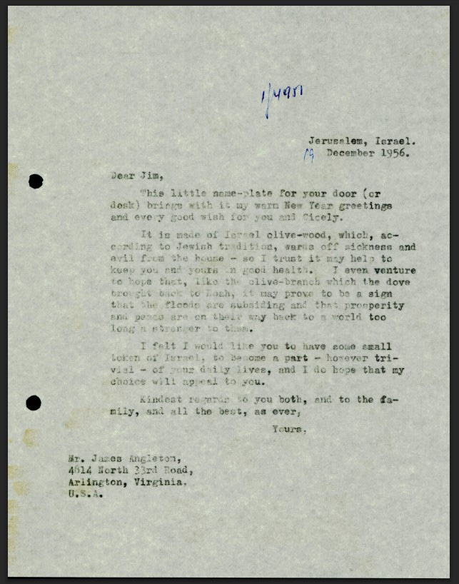 I went looking in the Israel State Archives. In a slim folder labeled Angleton, James, file ג-2838/146, are five letters Kollek sent to Angleton’s home in Arlington, Virginia between December 1955 and April 1958. Christmas gifts. Olive wood sent three weeks after Suez, while the United States was diplomatically punishing Israel. A reference to an aqualung Angleton “obtained” for Kollek that ended up with the Israeli combat commander who drove to Sharm el-Sheikh during the 1956 Sinai Campaign. Fishing tackle Angleton left behind at the Israeli Embassy in Washington, which, Kollek noted, “Reuven’s driver would know where” to find. Reuven Shiloah was the founder of the Mossad.